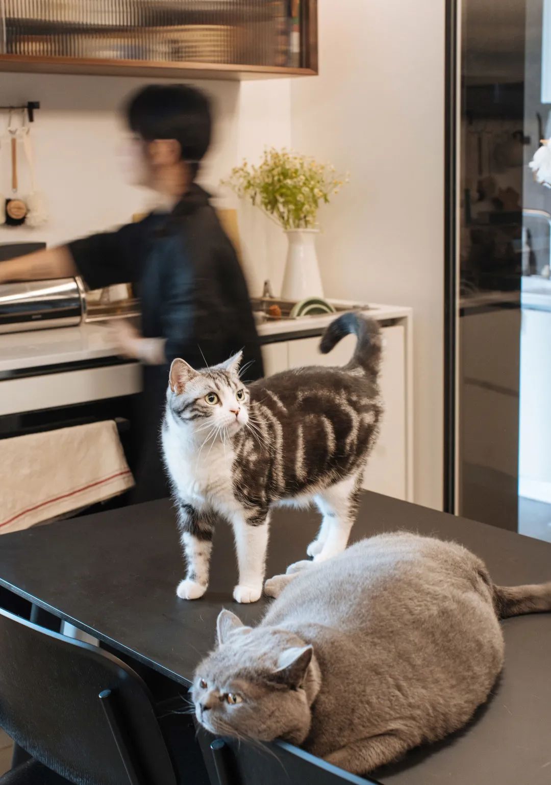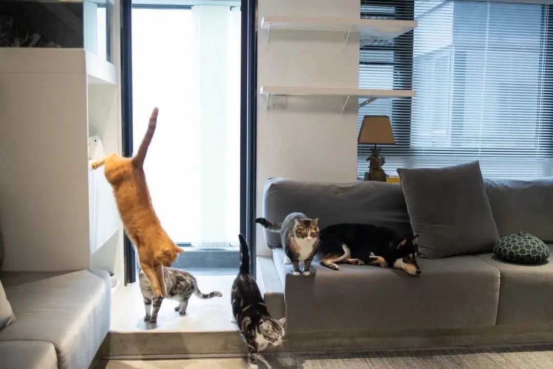 Q: 这一家的女主人书特别的喜爱动物,为了毛孩放弃了在世界500强的工作,转而经营了一家线上宠物用品商店,与先生焜也因此结缘。两人来成都定居后,不仅带来了原来陪伴自己的毛孩们,又先后收养了几只。于是,到目前为止,家里共有9只猫,2只狗。夫妻俩希望能给予它们最自由的生活,平时都是散养在家里。需求是:能根据它们的生活习惯设置专属空间,尽量将生活区与玩耍区域分开,但和人类要有互动。居家功能要齐全,要有非常充足的收纳空间,整体要易打扫。