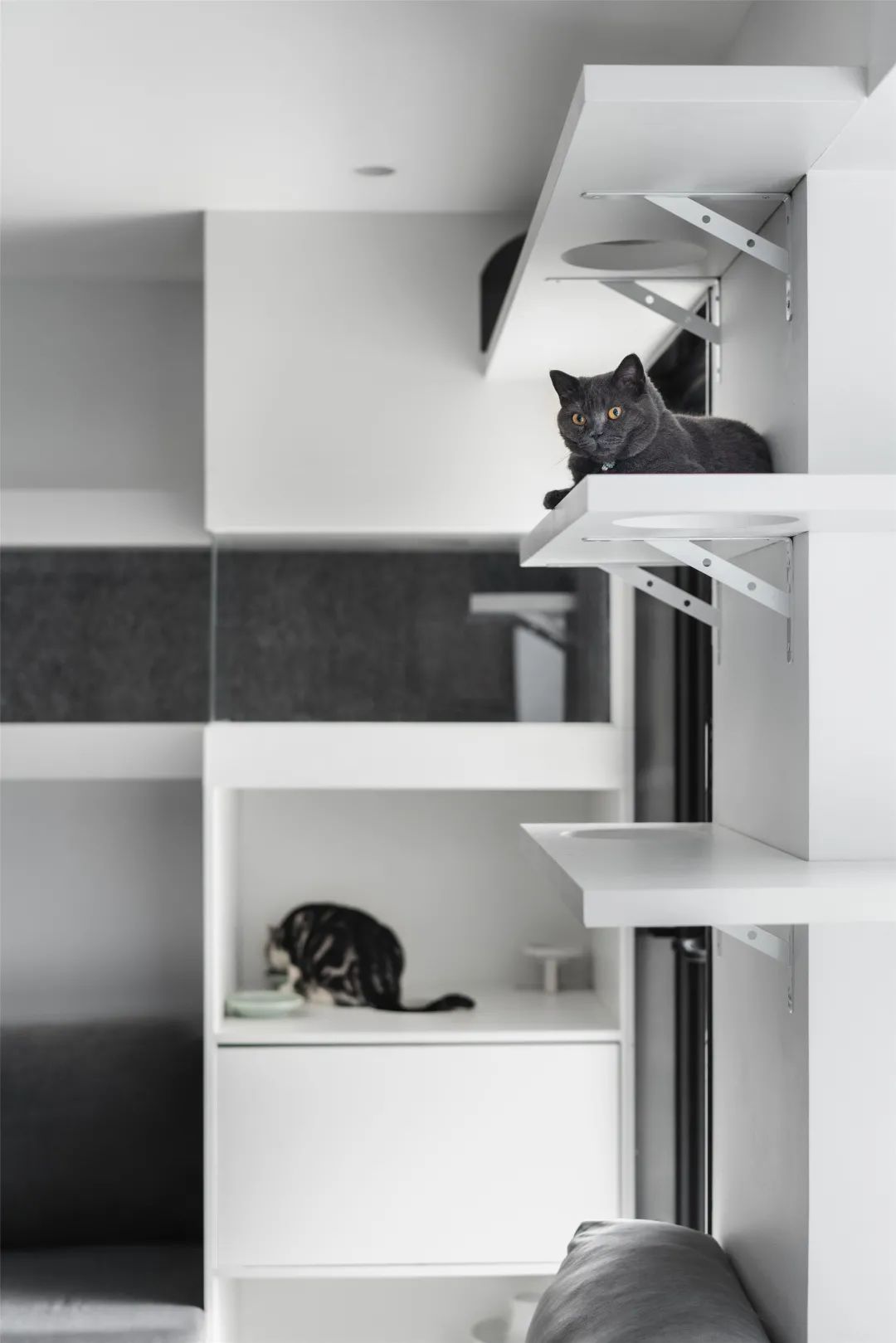 在跑道中靠墙一面都贴上了毛毡,配上另一面可推拉的玻璃门也方便清洁和更换毛毡。加厚不能敲掉的剪力墙体成一个小立柜,做成一条猫咪们的专属通道,既能用来隐藏插座,又能给猫咪们一个安心吃饭的空间。