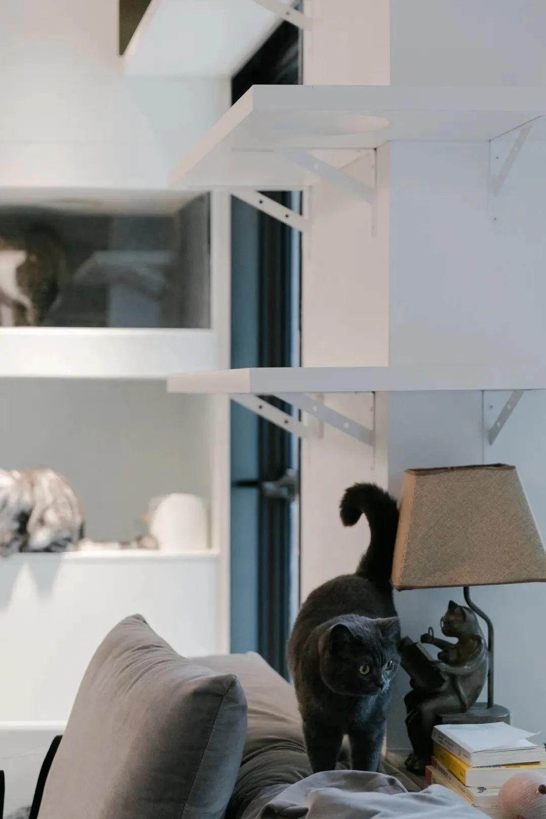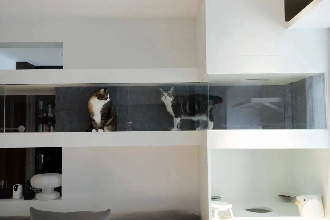 考虑到猫咪的生活习性,我们用定制的超白钢化玻璃打造了一个“空中猫爬架”,整个跑道有三条上下的通路。其中,从书桌的台面到上面的入口距离为60cm,这恰好是家里腿最短的那只猫能跳得上的高度。