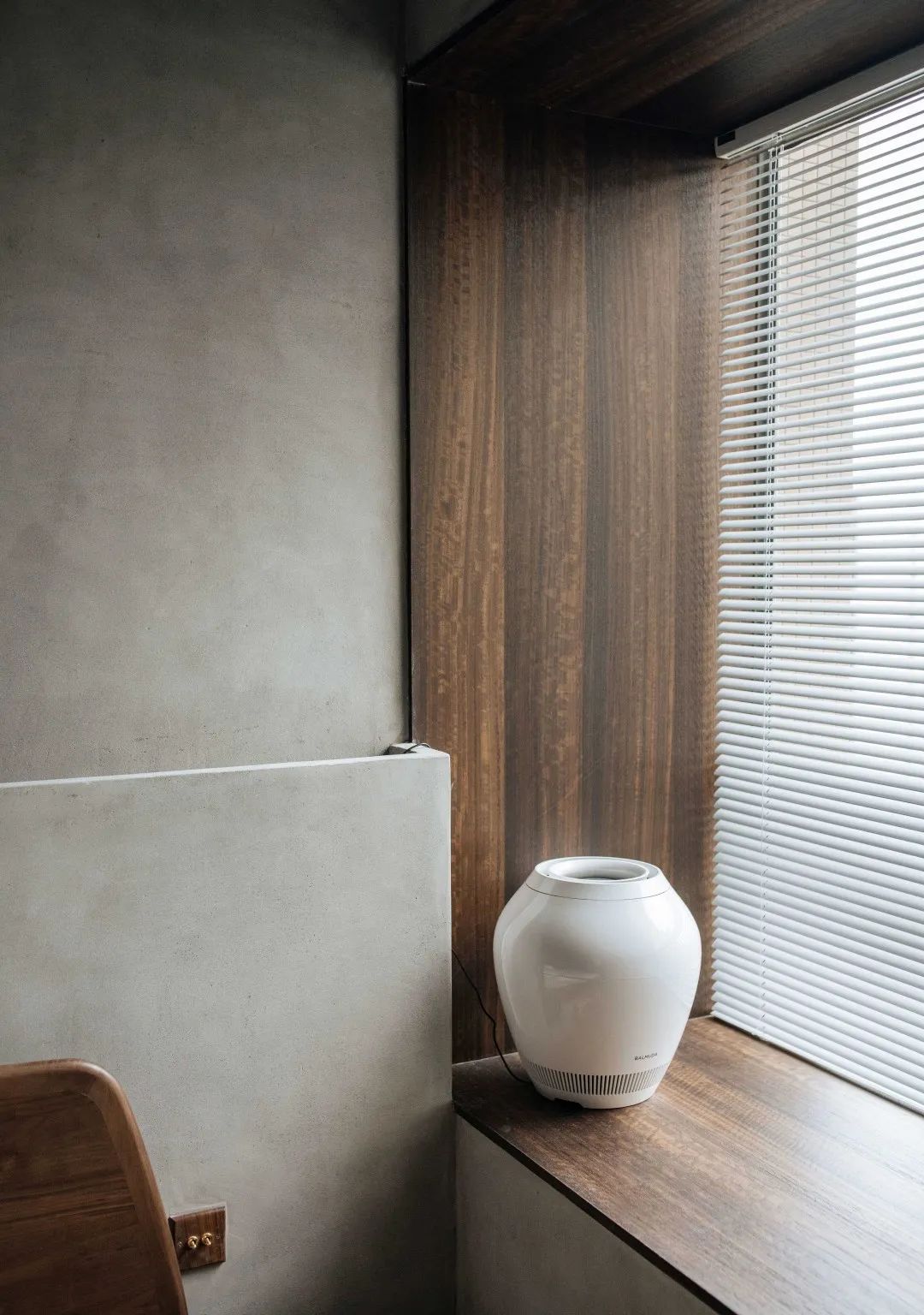 电视墙:以大量木作完成的电视墙,会带来强烈的体块感,能够很好地提升空间的利落与干净度,即使有十余位原住民、无数物件也不会让空间有杂乱逼仄感。而这里由两扇隐形门、被隐藏后的空调以及大容量的收纳柜组成。