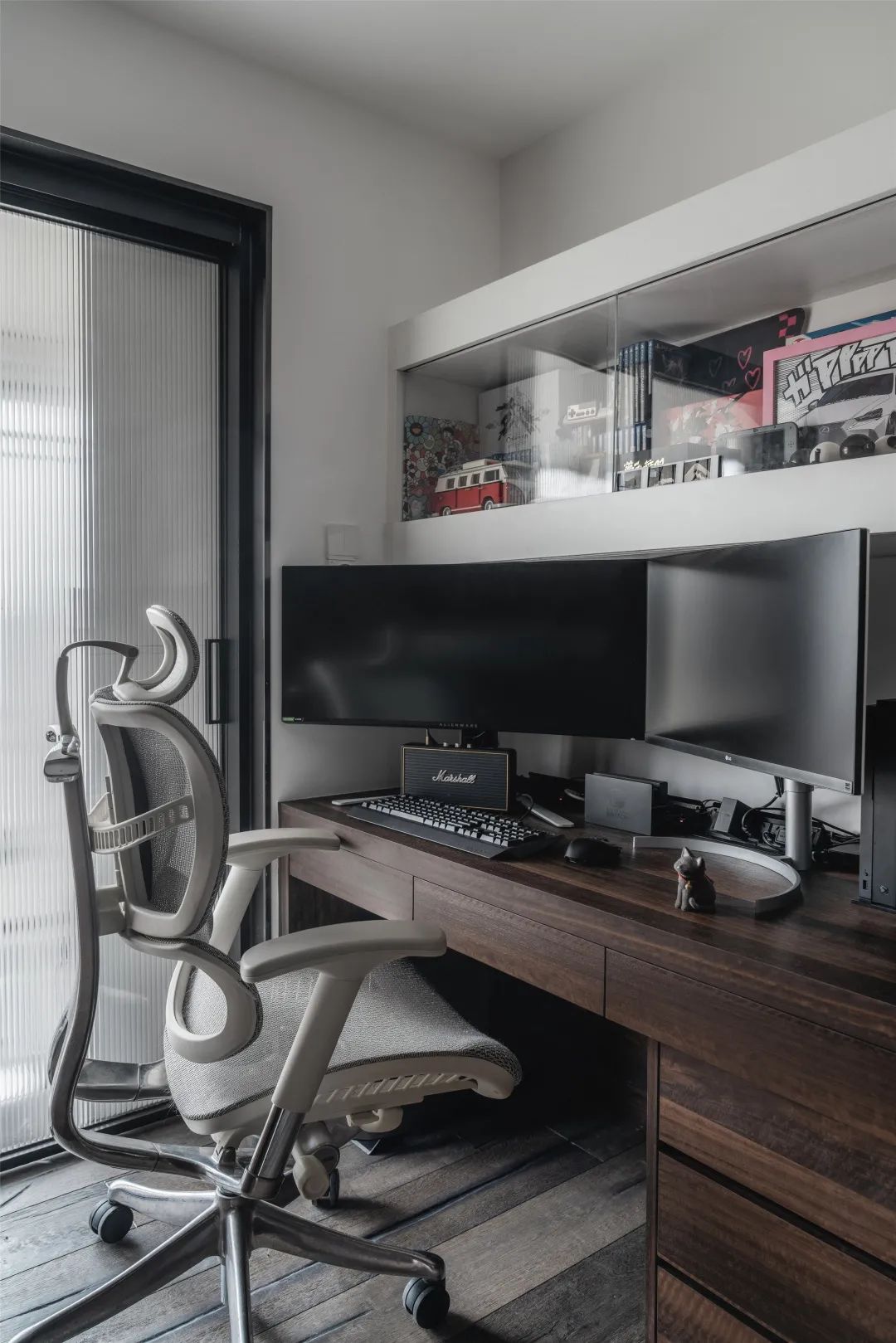 收纳空间:除了在客厅“建造”了隐形仓库,同时在书房以及夫妻俩人的卧室,也制作了大容量的收纳柜。